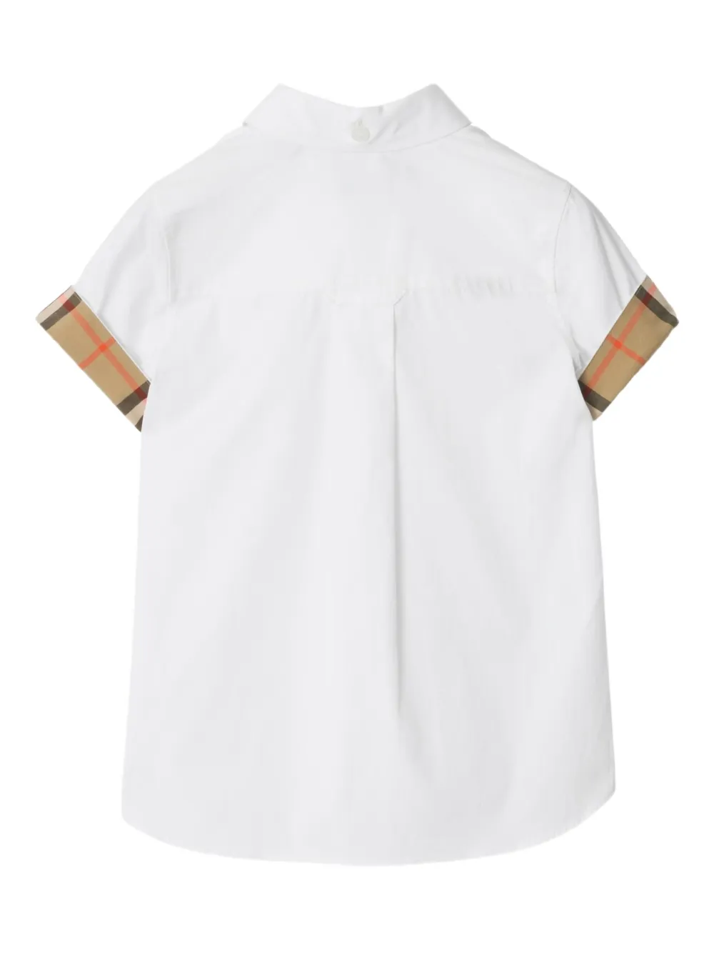 New Season Burberry Kids Check-trim short-sleeve shirt Imported Highlights white cotton Check-pattern trim embroidered Equestrian Knight Design button fastening point collar chest patch-pocket curved hem Composition Cotton 100% Washing instructions Machine Wash Product IDs FARFETCH ID: 32655517 Brand style ID: 8117167
