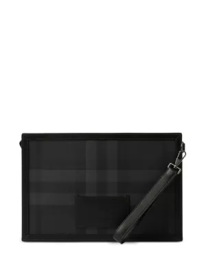 Burberry logo-plaque checked clutch bag Imported Highlights charcoal grey faux leather textured finish check print tonal logo plaque torchon piping detail tonal stitching rectangle shape top zip fastening single flat side handle main compartment Composition Outer: Thermoplastic Polyurethane (TPU) 70%, Cotton 30% Trims: Calf Leather 100% Lining: Polyamide 100% Product IDs FARFETCH ID: 21953269 Brand style ID: 8070205