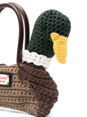 Charles Jeffrey Loverboy Duck tote bag Imported Highlights brown top handles zip fastening duck design woven construction logo plaque This piece comes complete with a protective dust bag. Composition Lining: Cotton 100% Outer: Cotton 100%, Calf Leather 100% Wearing The model is 6 ft 1 in wearing size OS Product IDs FARFETCH ID: 32442458 Brand style ID: 052120501