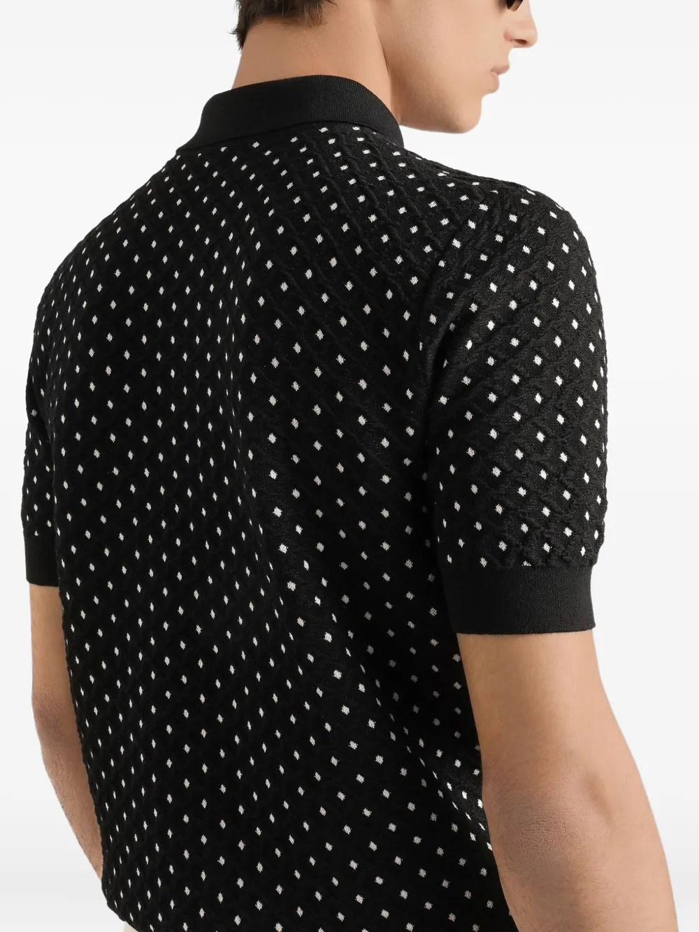 New Season Dolce & Gabbana polka-dot buttoned polo shirt Made in Italy Highlights black polka-dot pattern button fastening ribbed trims short sleeves polo collar Composition Virgin Wool 60%, Silk 23%, Polyester 17% Washing instructions Read Manufacturer Guidelines Product IDs FARFETCH ID: 32466404 Brand style ID: GXZ02ZJGMFB