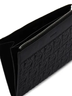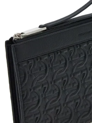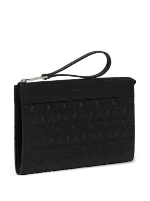 New Season Ferragamo logo-embossed leather clutch bag Made in Italy Highlights black leather all-over embossed logo print silver-tone hardware top zip fastening wrist strap partitioned compartment Composition Outer: CALFSKIN 100% Lining: Fabric 95%, CALFSKIN 5% Product IDs FARFETCH ID: 21851352 Brand style ID: 769473