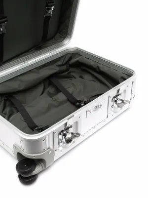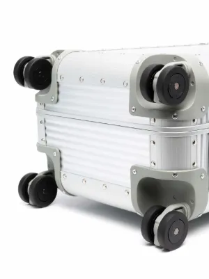 New Season FPM Milano Bank S Spinner 53 studded cabin suitcase Made in Italy Highlights moonlight silver-tone aluminum/leather stud detailing leather trim silver-tone hardware combination lock telescopic handle partitioned compartment full lining internal zip-fastening pockets four wheels Composition Lining: Polyester 100%, Calf Leather 100% Outer: Aluminium 100% Product IDs FARFETCH ID: 17443164 Brand style ID: A1805315826