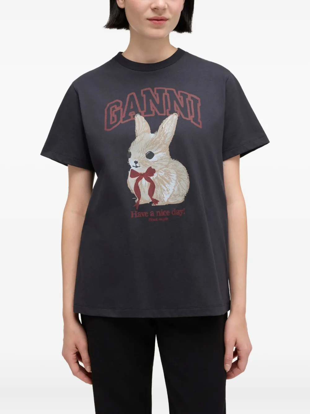 New Season GANNI Bunny-print cotton T-shirt Imported Highlights dark grey bunny print graphic round neck short sleeves Composition Organic Cotton 100% Washing instructions Read Manufacturer Guidelines Product IDs FARFETCH ID: 32269714 Brand style ID: A1050061
