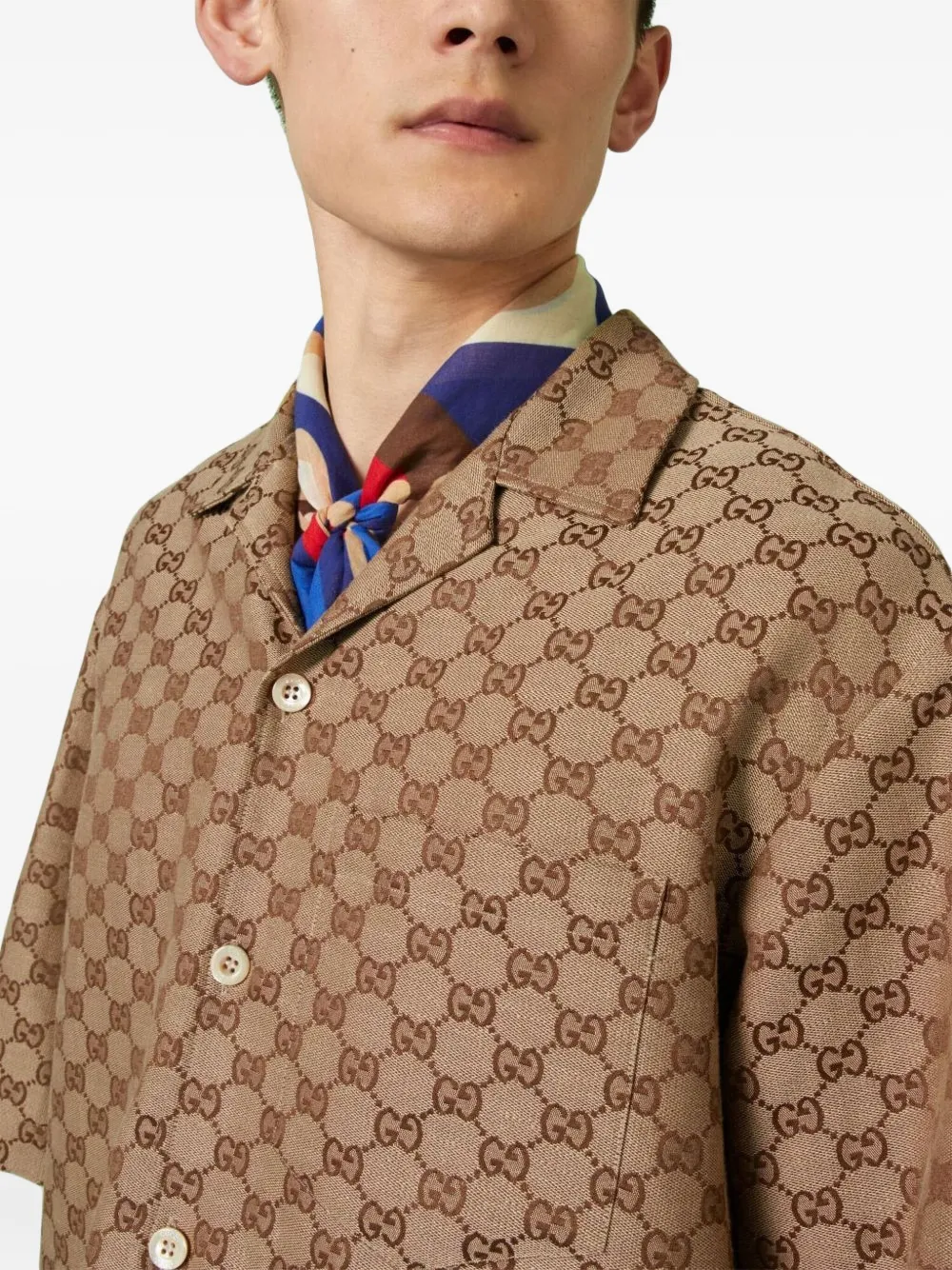 Trending Gucci GG short-sleeved linen shirt Made in Italy Highlights brown linen/flax signature GG Supreme print notched collar front button fastening short sleeves chest patch pocket straight hem Composition Linen/Flax 68%, Polyester 32% Washing instructions Read Manufacturer Guidelines Product IDs FARFETCH ID: 20374681 Brand style ID: 742707ZAM7G2580