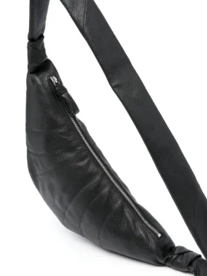 LEMAIRE medium Croissant leather bag Inspired by the shape of a croissant pastry, this bag silhouette is obviously Lemaire. In a monochromatic hue, understated elements such as stitch detailing enhance. Imported Highlights black leather grained texture panelled design knot detailing to the strap internal logo patch top zip fastening single shoulder strap main compartment internal patch pocket cotton lining This piece comes complete with a protective dust bag. Composition Outer: Leather 100% Lining: Cotton 100% Wearing The model is 6 ft 2 in wearing size OS Product IDs FARFETCH ID: 22622285 Brand style ID: BG0001LL0018