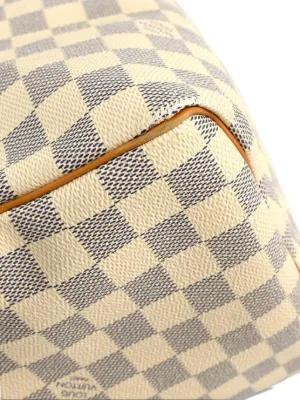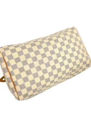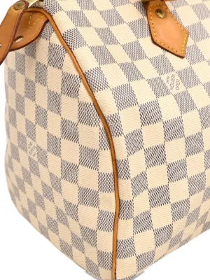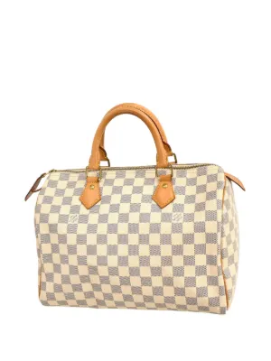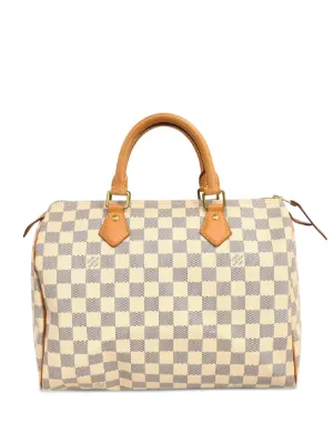 Pre-Owned Louis Vuitton Pre-Owned 2014 Damier Azur Speedy 30 handbag Made in France Highlights circa 2014 white leather trim signature Damier Azur canvas two top handles top zip fastening main compartment Condition: GOOD. This previously owned and used item is in good condition with minimal signs of use. This may include fading of material or plating and scratches. Condition Good Learn More About Condition Rating Composition Lining: Leather 100% Body: PVC 100% Product IDs FARFETCH ID: 30452691 Brand style ID: XX33654