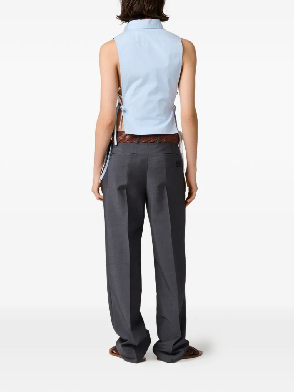 Runway Miu Miu embroidered tie-side shirt Highlights light blue shirt collar front button closure sleeveless side openings tie detail embroidered logo Composition Cotton 100% Washing instructions Read Manufacturer Guidelines Product IDs FARFETCH ID: 33763024 Brand style ID: MK2024SOOO19SE
