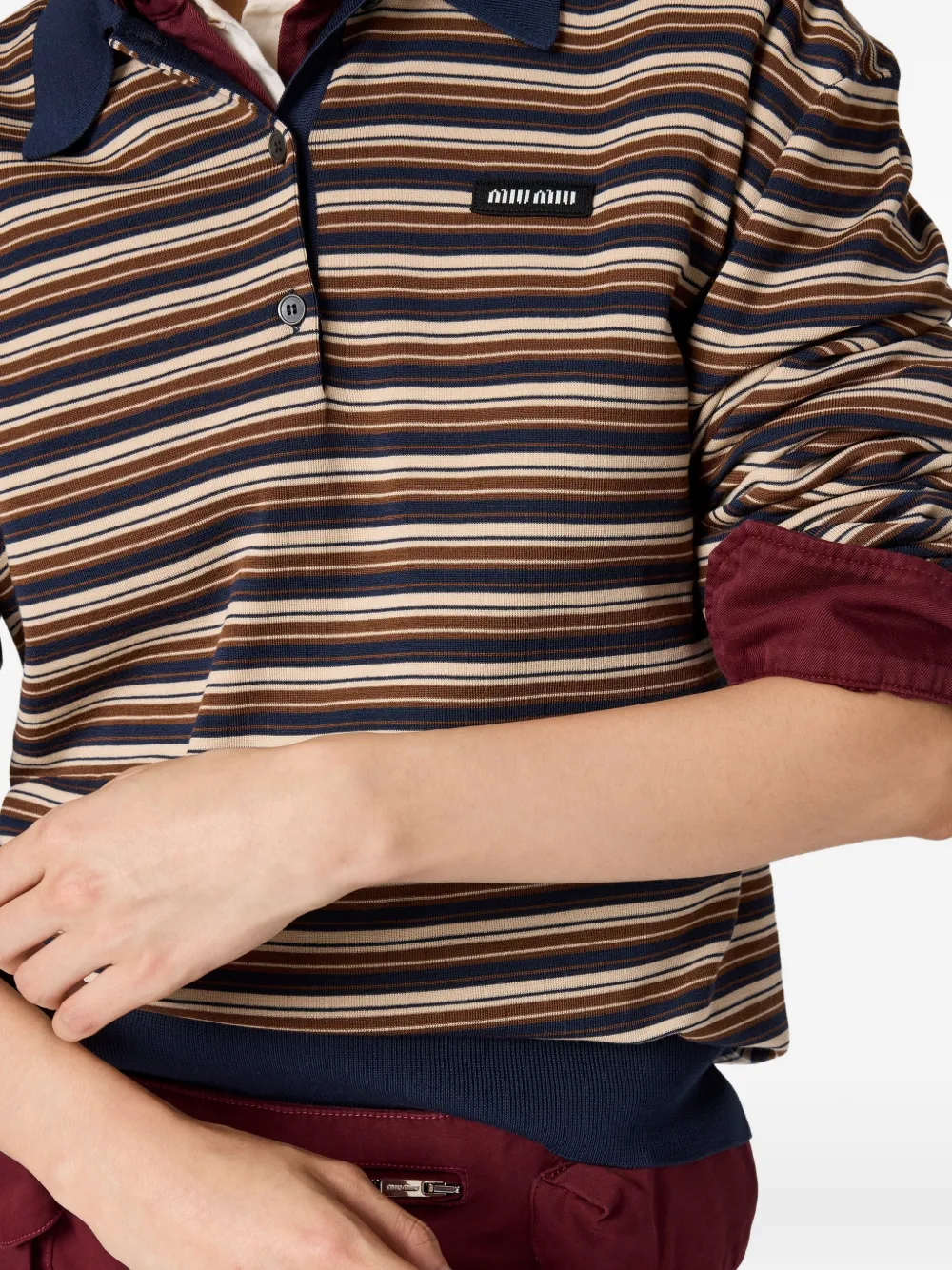 New Season Miu Miu striped polo polo top Highlights beige and brown striped design ribbed cuffs and hem long sleeves three-button closure logo patch Composition Virgin Wool 100% Washing instructions Specialist Cleaning Product IDs FARFETCH ID: 33408282 Brand style ID: MML03VSOOO1844