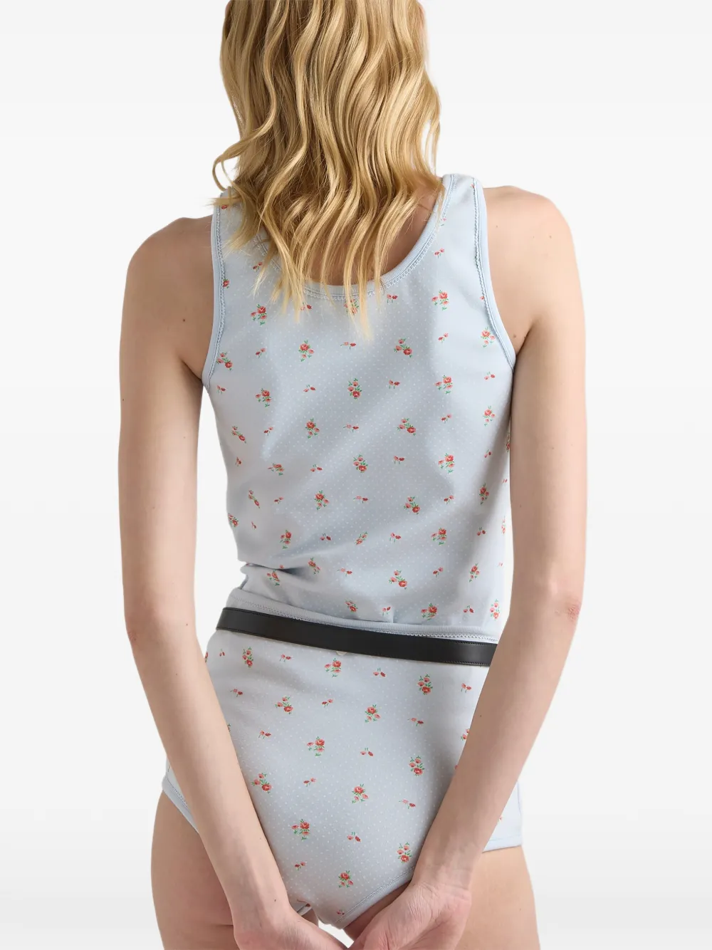 New Season Prada bouquet print ribbed knit top Highlights light blue floral print ribbed knit scoop neck enameled metal triangle logo slim fit Composition Fabric 100% Washing instructions Read Manufacturer Guidelines Product IDs FARFETCH ID: 33826777 Brand style ID: 39659CSOOO19AX