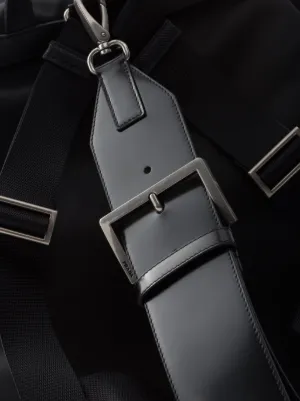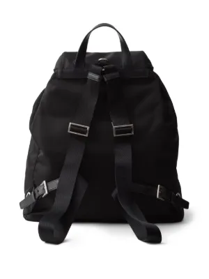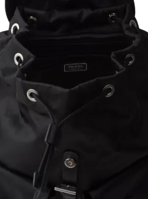 Prada Re-Nylon backpack Highlights black recycled nylon pin-buckle fastening foldover top with magnetic fastening drawstring fastening loop handle adjustable detachable shoulder strap two adjustable shoulder straps enamel triangle logo two front flap pockets main compartment full lining internal patch pocket internal zip-fastening pocket internal logo plaque Composition Outer: Recycled Nylon 100%, Calf Leather 100% Lining: Recycled Nylon 100% Product IDs FARFETCH ID: 26255889 Brand style ID: 2VZ110VSOO2C26