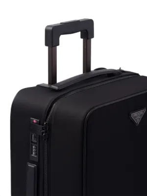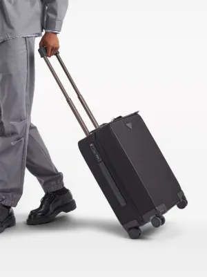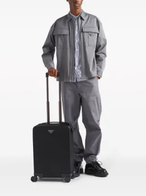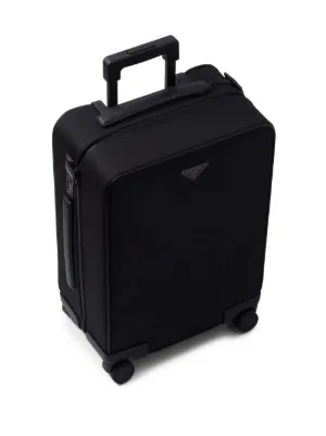 New Season Prada Re-Nylon triangle-logo trolley Highlights black calf leather/recycled nylon/recycled polyamide rectangle shape enamel triangle logo single top handle single flat side handle all-around zip fastening Composition Lining: Recycled Nylon 100% Outer: Calf Leather 100%, Recycled Polyamide 100% Product IDs FARFETCH ID: 22542169 Brand style ID: 2VQ005VOOO2DMH