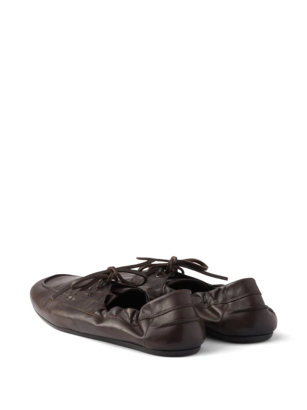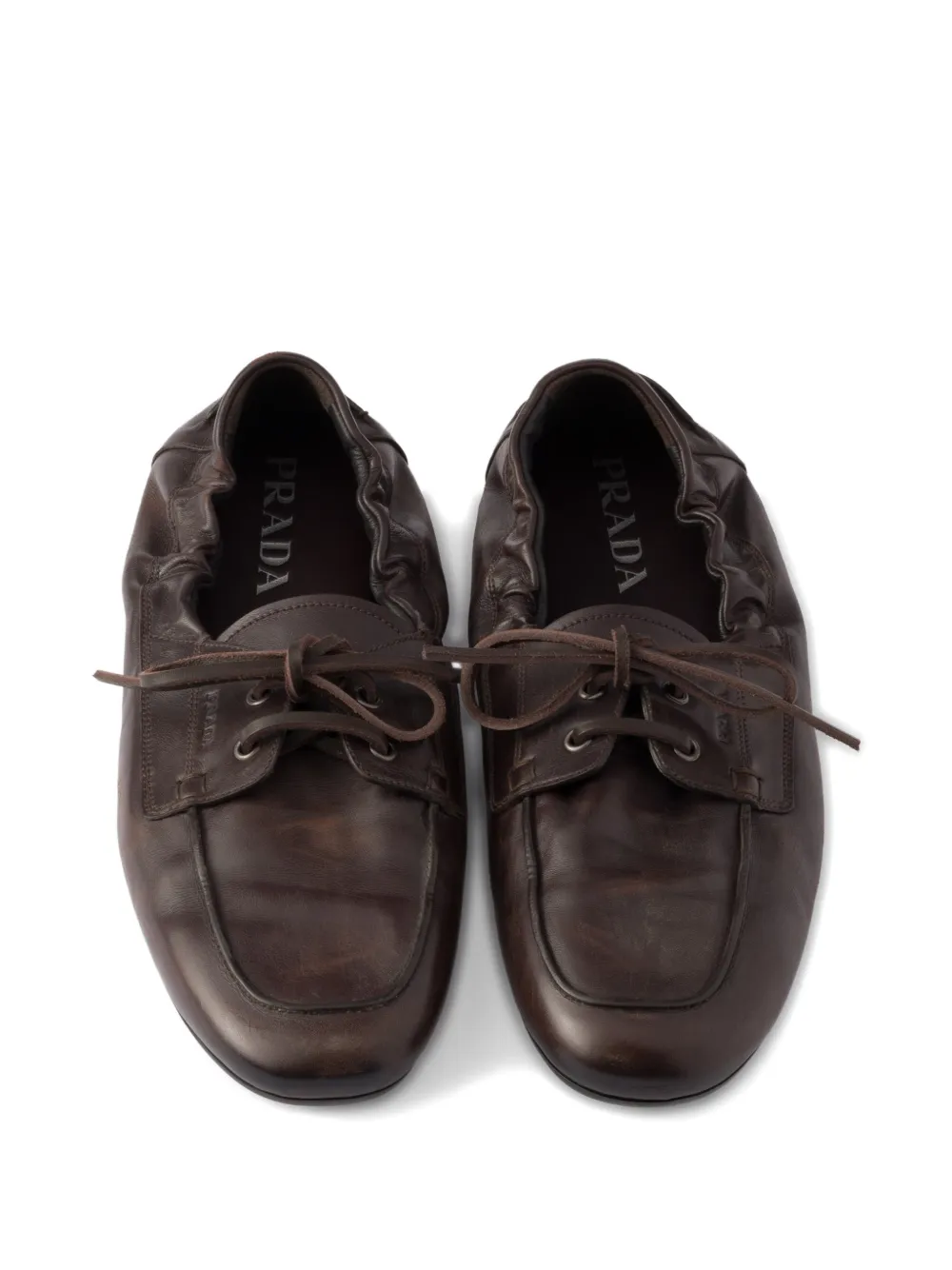 New Season Prada Shuffle Antiqued lace-up boat shoes Highlights brown upper eyelets printed logo lace up Composition Outer: Calf Leather 100% Lining: Calf Leather 100% Sole: Calf Leather 100% Product IDs FARFETCH ID: 33763040 Brand style ID: 2EG504FG0127V6