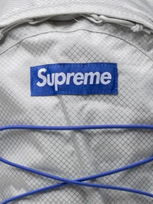 Supreme logo-patch backpack Supreme pairs relaxed style and practicality with this backpack. Boasting a 23 litre volume and adjustable drawstring to the front, it is detailed with the iconic box logo for a branding-focused finish. Made in United States Composition Outer: Nylon 100% Product IDs FARFETCH ID: 18166672 Brand style ID: SU11533