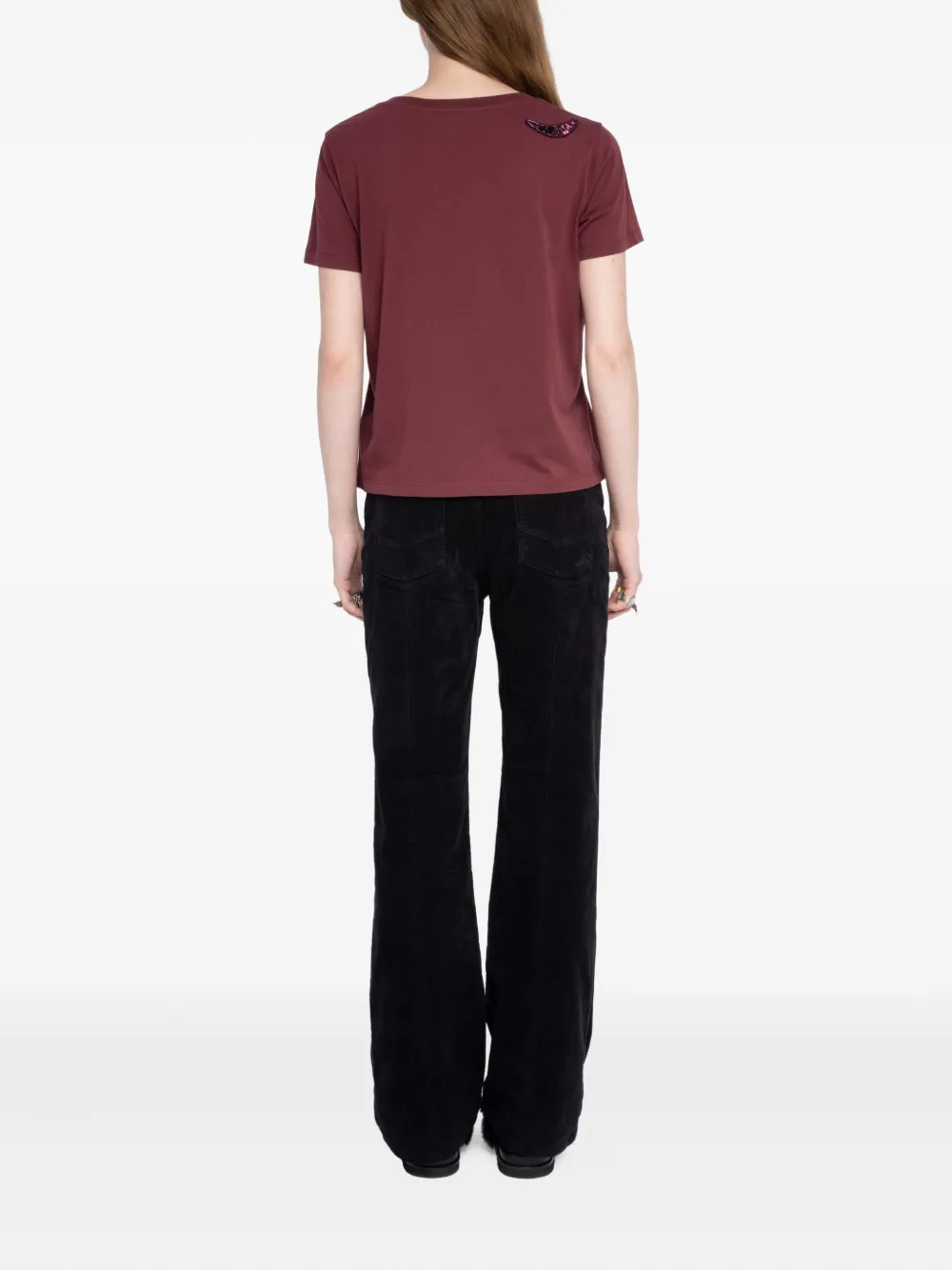 Zadig&Voltaire Alys T-shirt Imported Highlights burgundy wings embellishment round neck short sleeves organic cotton Composition Organic Cotton 100% Washing instructions Machine Wash Product IDs FARFETCH ID: 29852308 Brand style ID: JWTS02821